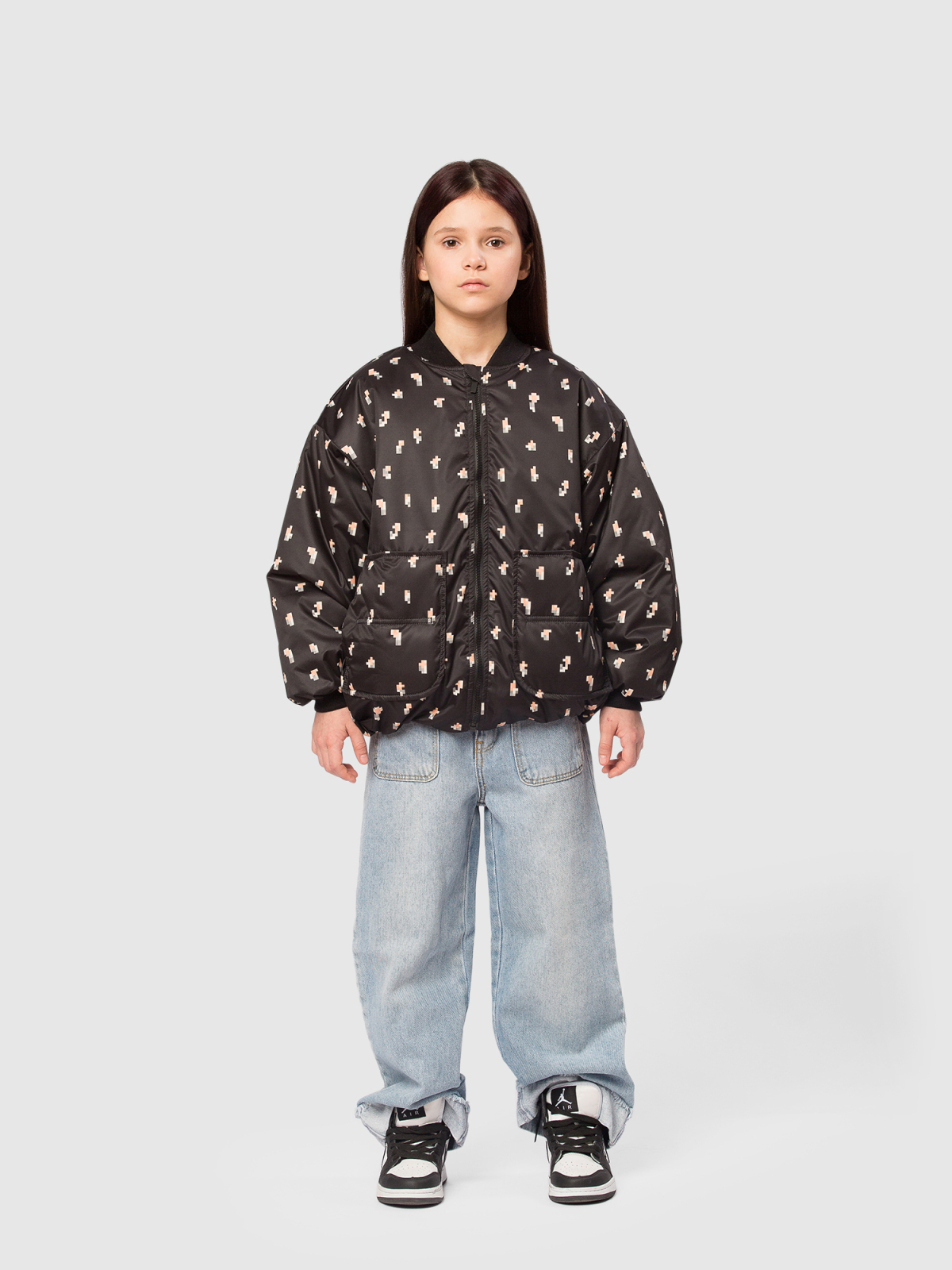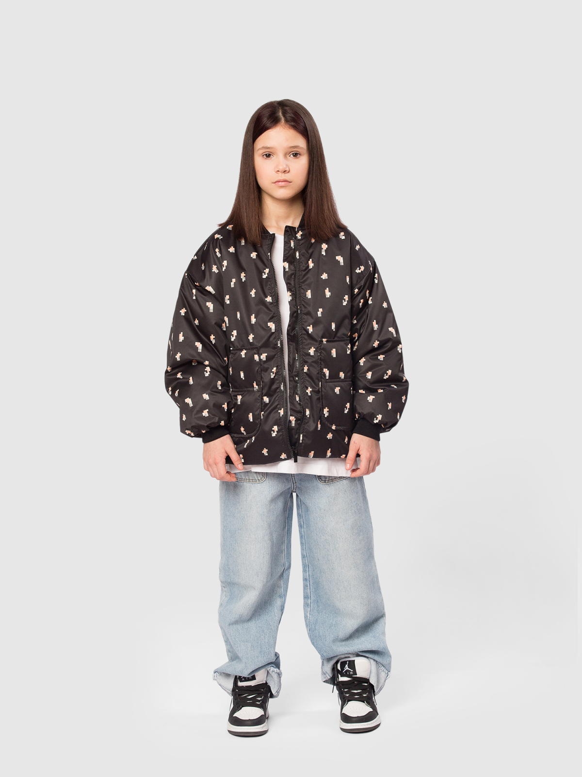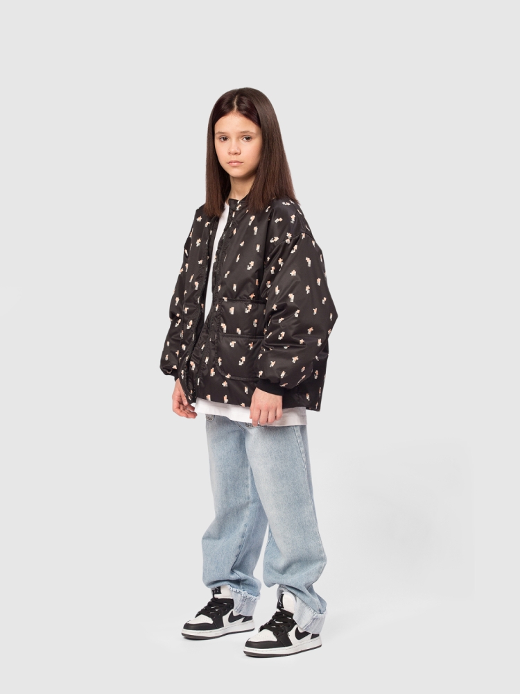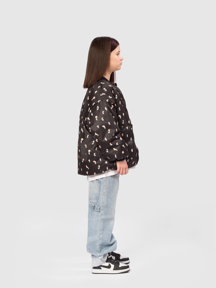 Оригинальная куртка бомбер оверсайз для девочки — современная и практичная модель, созданная для активных прогулок и повседневной носки. Верх выполнен из ткани с водоотталкивающей пропиткой и украшен милым пиксельным цветочным принтом, который придаёт образу свежести и игривости. Внутренняя подкладка — из мягкого полиэстера, а утеплитель Thermofin плотностью 100 г/м² обеспечивает оптимальное тепло и лёгкость, делая куртку комфортной в межсезонье при температуре от 0 до +10 °C. Модель оснащена тёплым трикотажным воротником и эластичными трикотажными манжетами, которые хорошо защищают от ветра и удерживают тепло. Удобная центральная молния дополняется внутренней ветрозащитной планкой и клапаном защитой у подбородка, предотвращающим защемления и обеспечивающим комфорт при застёгивании. Практичность усилена двумя глубокими накладными карманами, куда удобно положить мелочи или согреть руки. По нижней части изделия проходит регулируемая кулиска со стопперами — она позволяет подстроить объём и создать нужный силуэт.