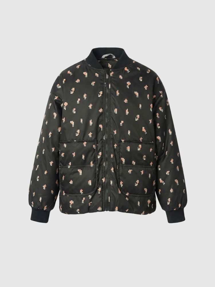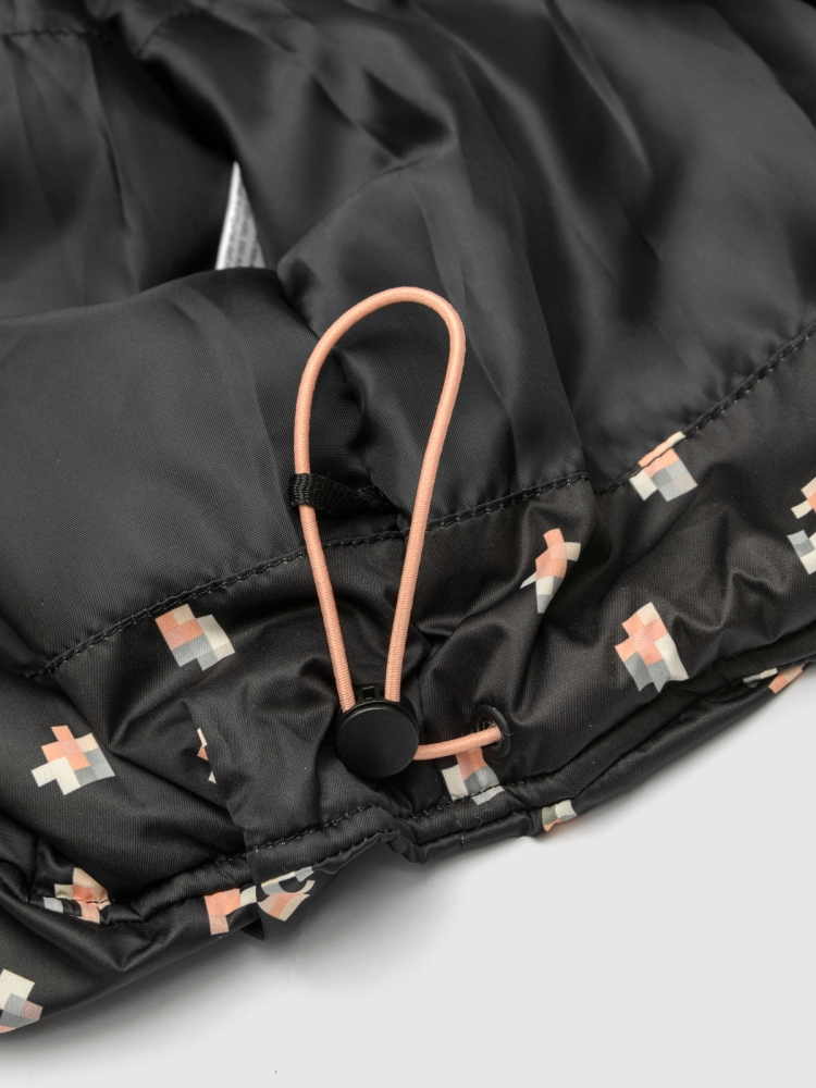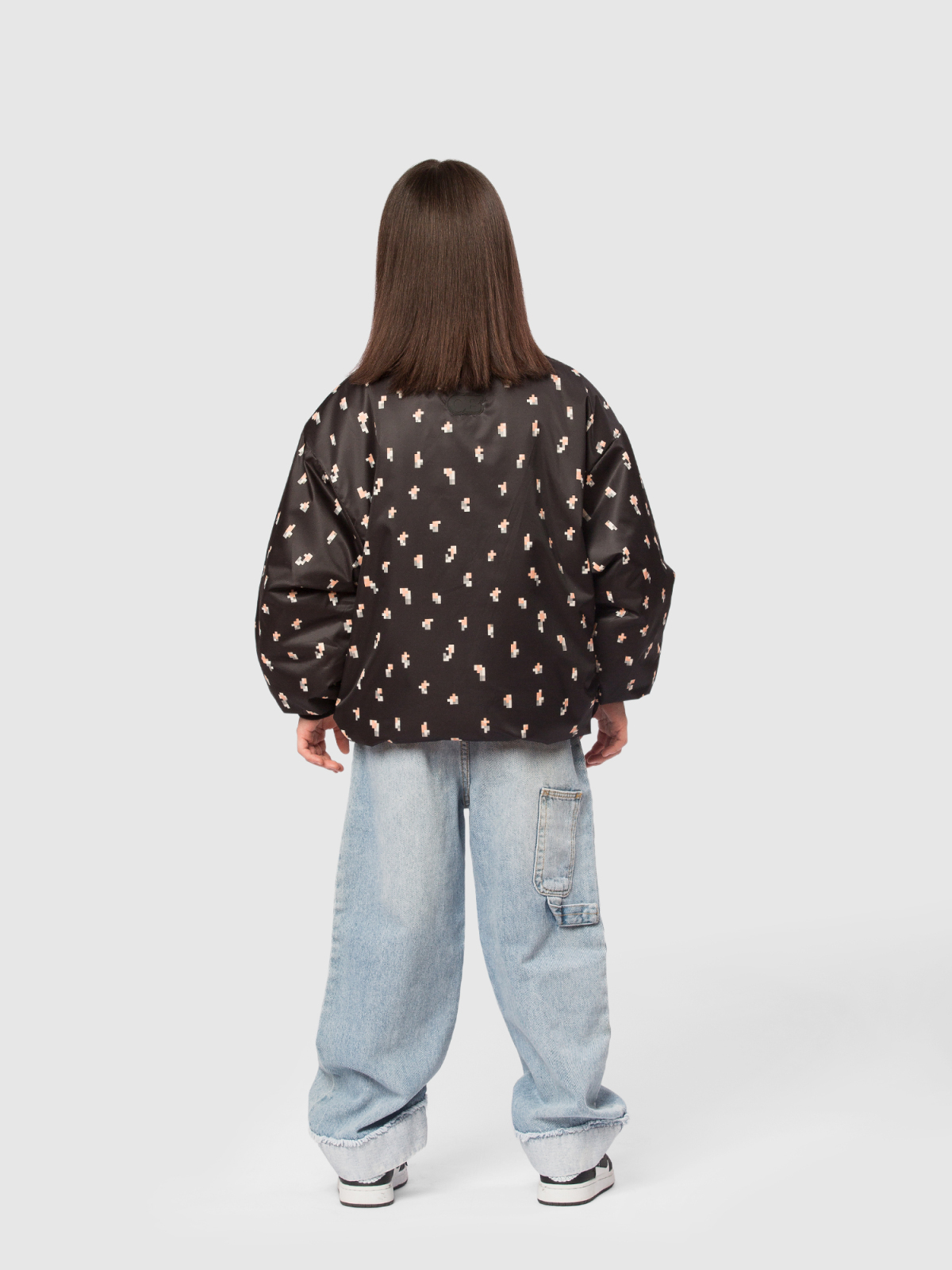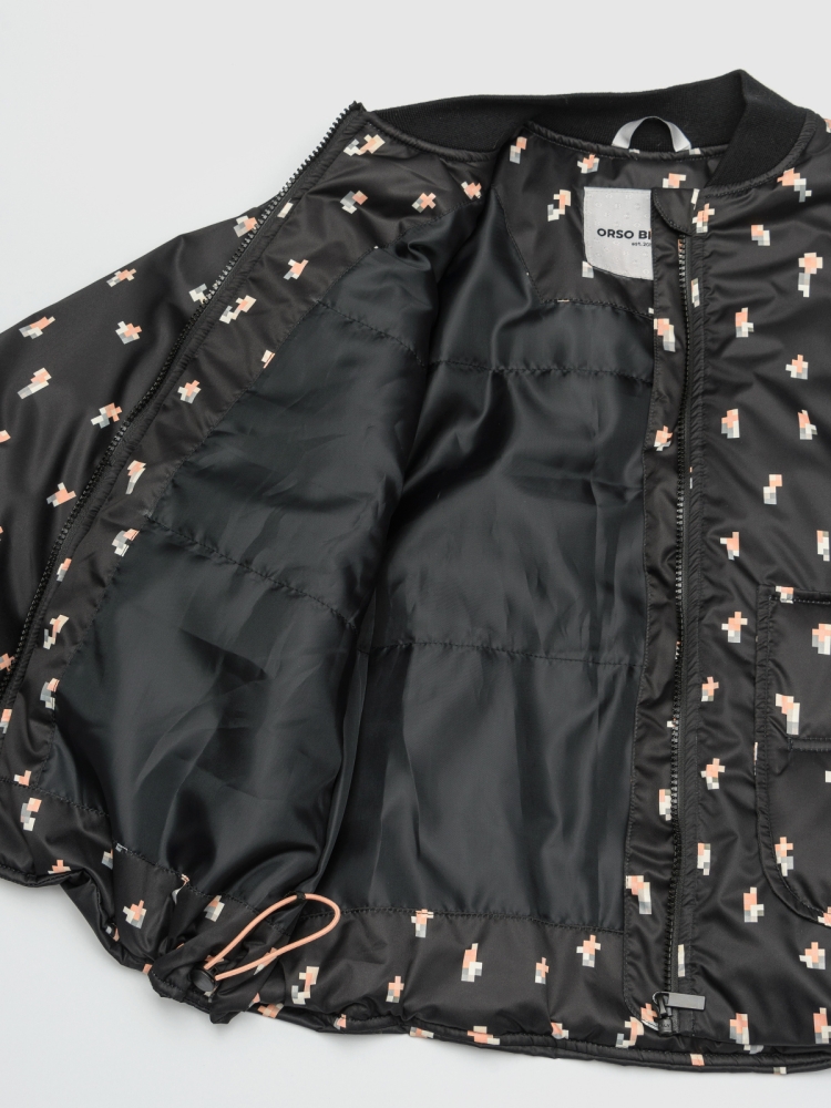 Оригинальная куртка бомбер оверсайз для девочки — современная и практичная модель, созданная для активных прогулок и повседневной носки. Верх выполнен из ткани с водоотталкивающей пропиткой и украшен милым пиксельным цветочным принтом, который придаёт образу свежести и игривости. Внутренняя подкладка — из мягкого полиэстера, а утеплитель Thermofin плотностью 100 г/м² обеспечивает оптимальное тепло и лёгкость, делая куртку комфортной в межсезонье при температуре от 0 до +10 °C. Модель оснащена тёплым трикотажным воротником и эластичными трикотажными манжетами, которые хорошо защищают от ветра и удерживают тепло. Удобная центральная молния дополняется внутренней ветрозащитной планкой и клапаном защитой у подбородка, предотвращающим защемления и обеспечивающим комфорт при застёгивании. Практичность усилена двумя глубокими накладными карманами, куда удобно положить мелочи или согреть руки. По нижней части изделия проходит регулируемая кулиска со стопперами — она позволяет подстроить объём и создать нужный силуэт.