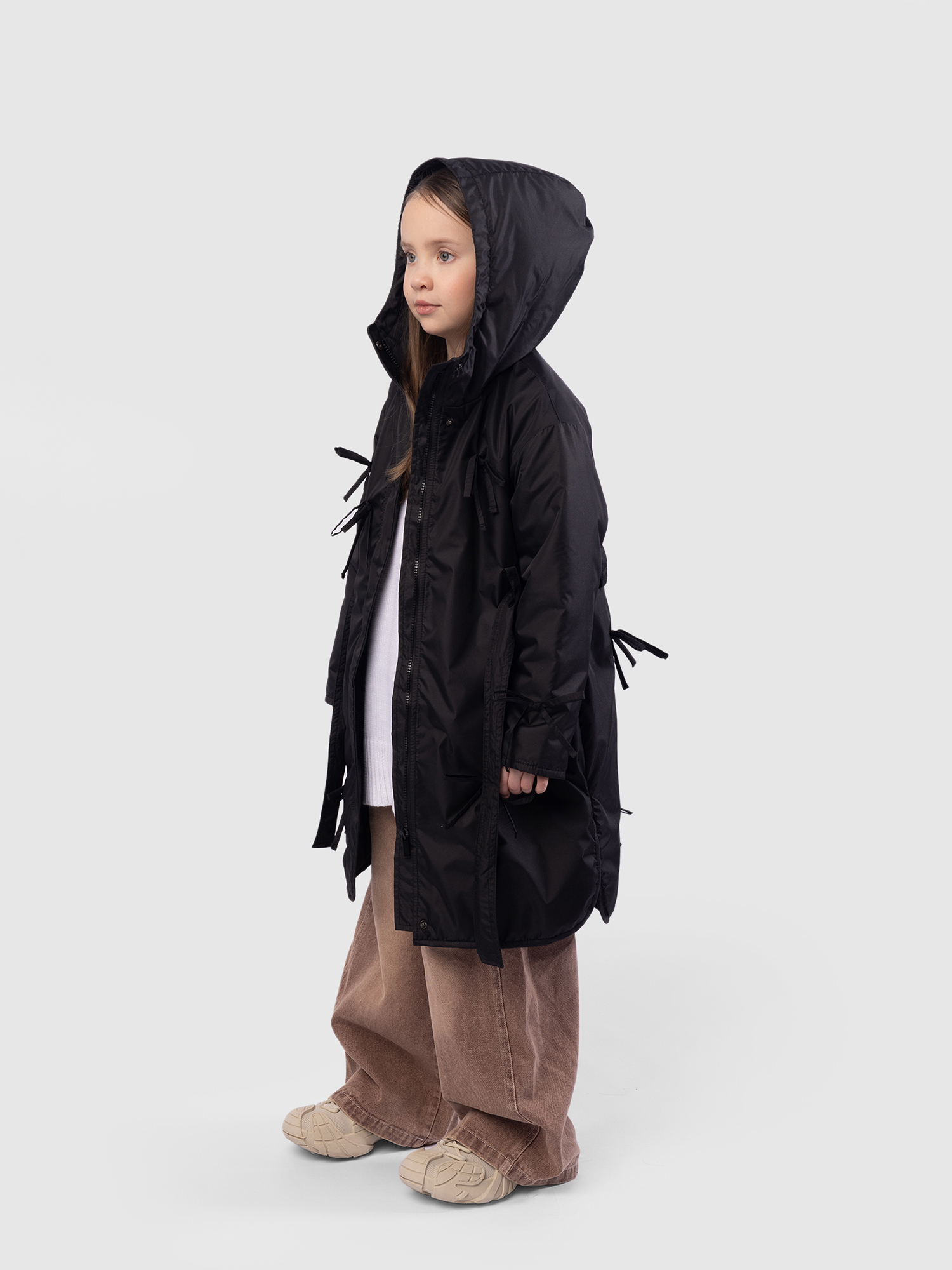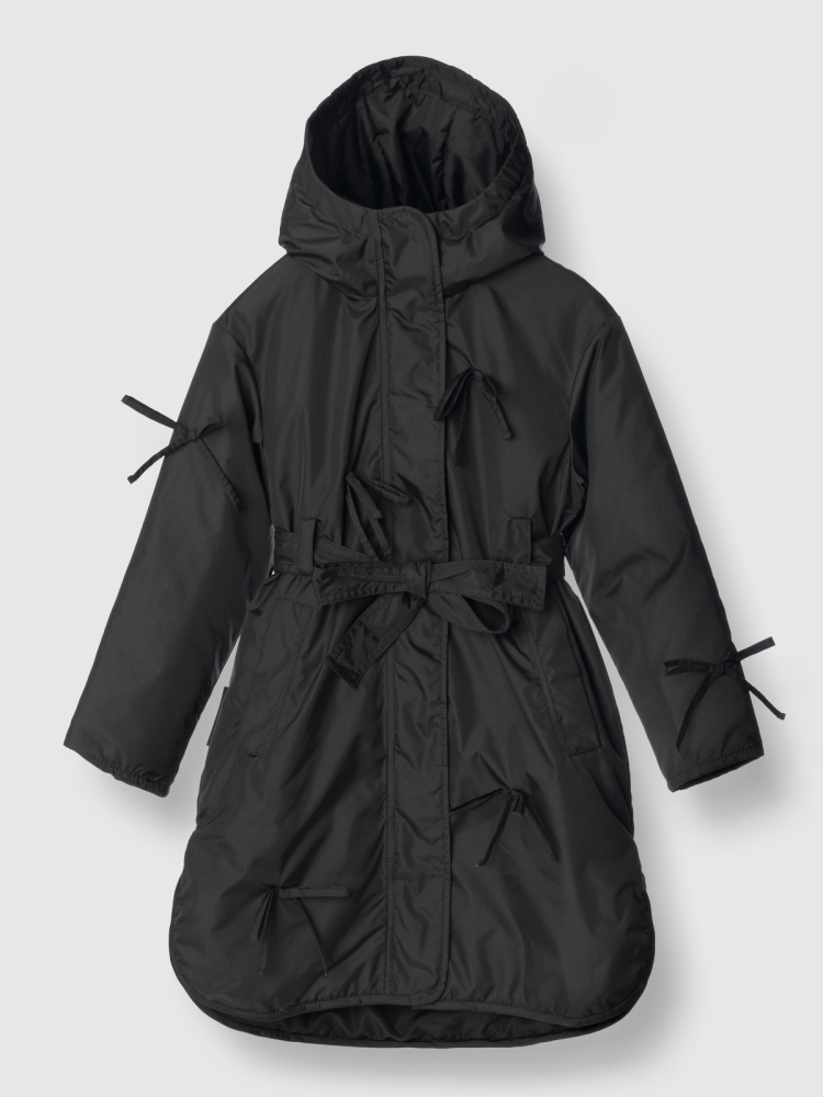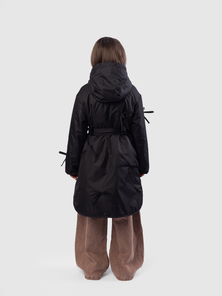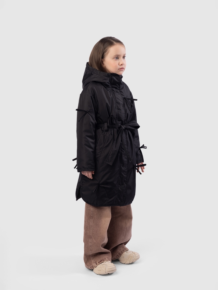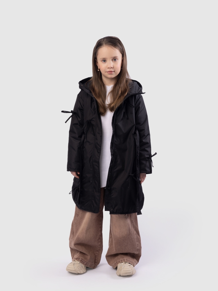 Утепленное пальто для девочки — стильное и практичное решение на весну и осень. Высокий воротник плавно переходит в глубокий втачной капюшон, надежно защищая от ветра и легкой влаги. Застежка на молнию дополнена внешней ветрозащитной планкой на кнопках по всей длине для дополнительного комфорта. Верх выполнен из ткани с водоотталкивающей пропиткой, подкладка из гладкого полиэстера приятна к телу и не цепляется за одежду, утеплитель Thermofin 100 г обеспечивает оптимальный температурный режим от 0 до +10 градусов без лишнего объема. Два глубоких кармана удобны для перчаток и мелочей. По бокам — разрезы в рубашечном стиле для свободы движений. Шлевки и пояс в комплекте помогают подчеркнуть силуэт, а декоративные бантики придают образу нежность и аккуратный нарядный акцент. Небольшой логотип бренда размещен в боковом шве, не отвлекая от общей эстетики. Пальто гармонично сочетается с повседневной и школьной одеждой, подходит для активных прогулок и городских образов. Легкое в уходе, сохраняет форму и цвет после с