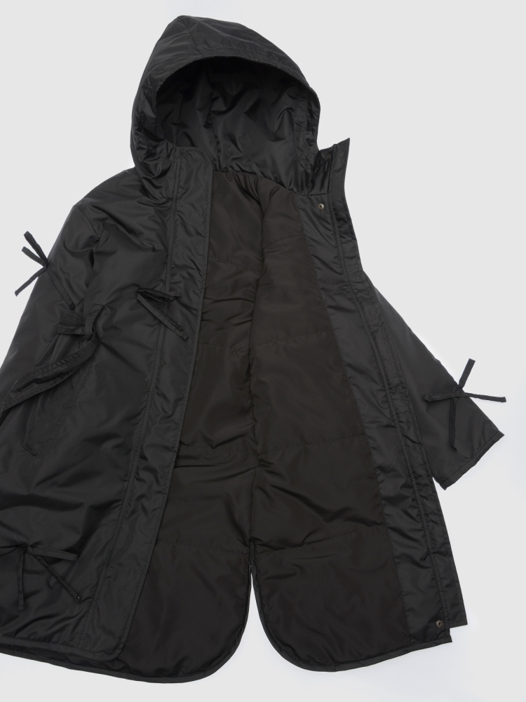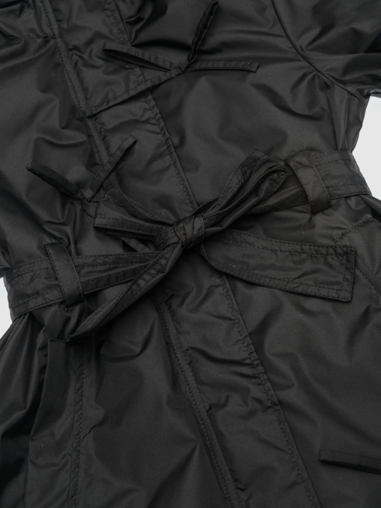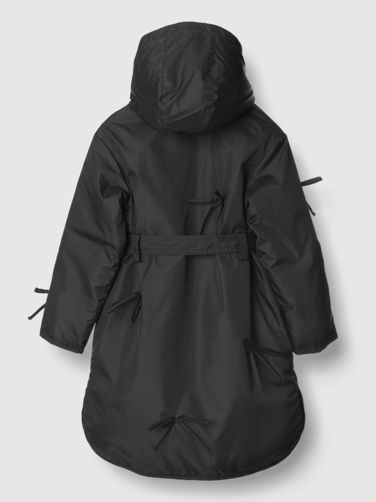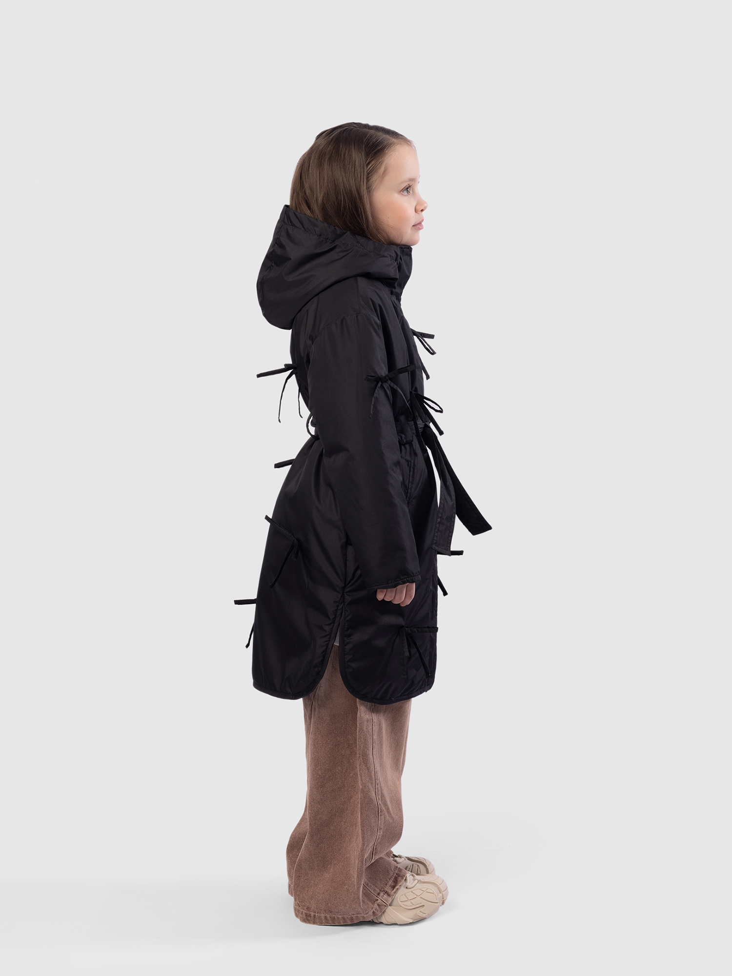 Утепленное пальто для девочки — стильное и практичное решение на весну и осень. Высокий воротник плавно переходит в глубокий втачной капюшон, надежно защищая от ветра и легкой влаги. Застежка на молнию дополнена внешней ветрозащитной планкой на кнопках по всей длине для дополнительного комфорта. Верх выполнен из ткани с водоотталкивающей пропиткой, подкладка из гладкого полиэстера приятна к телу и не цепляется за одежду, утеплитель Thermofin 100 г обеспечивает оптимальный температурный режим от 0 до +10 градусов без лишнего объема. Два глубоких кармана удобны для перчаток и мелочей. По бокам — разрезы в рубашечном стиле для свободы движений. Шлевки и пояс в комплекте помогают подчеркнуть силуэт, а декоративные бантики придают образу нежность и аккуратный нарядный акцент. Небольшой логотип бренда размещен в боковом шве, не отвлекая от общей эстетики. Пальто гармонично сочетается с повседневной и школьной одеждой, подходит для активных прогулок и городских образов. Легкое в уходе, сохраняет форму и цвет после с