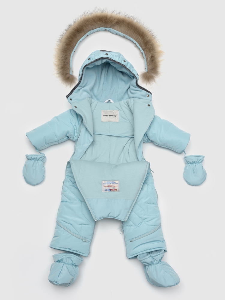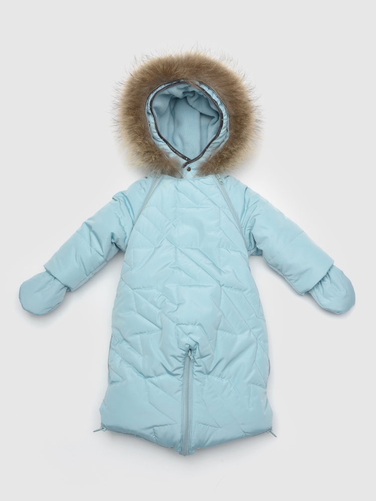Зимний комбинезон-трансформер для малышей с вариацией «конверт» — это идеальный выбор для холодного времени года. Он изготовлен из качественной ткани с водоотталкивающей пропиткой, которая защищает ребёнка от влаги и грязи. Функциональная и стильная модель представлена в разнообразных цветах, что позволяет подобрать вариант как для мальчиков, так и для девочек. Дополнительные молнии в области штанин позволяют использовать комбинезон в качестве утеплённого конверта для новорождённых детей. Утеплитель «Термофин» с плотностью 300 г равномерно распределён по всему изделию, обеспечивая комфорт и сохранение тепла. Подкладка из натурального хлопка и мягкий велюр в крагах и пинетках создают приятные тактильные ощущения. Две удобные молнии облегчают процесс одевания, а ветрозащитные планки на внутренней стороне изделия защищают от сквозняков. Несъёмный капюшон украшен съёмной опушкой из натурального меха и нашивкой с логотипом бренда, а декоративная стёжка по всему изделию придаёт изюминку и оригинальность. Для защиты