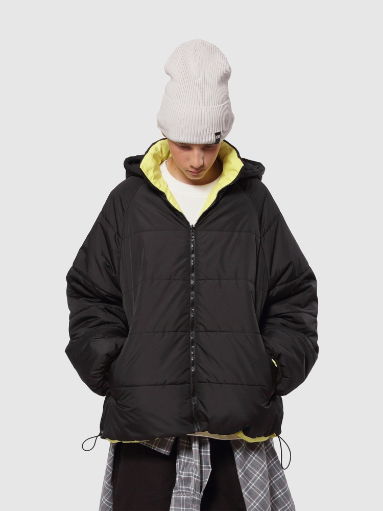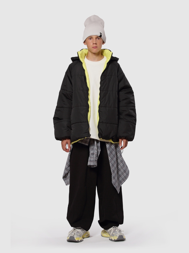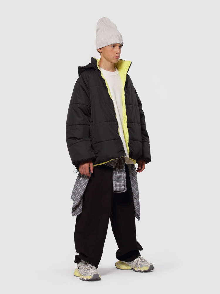 Куртка бомбер для мальчика-подростка — стильная и практичная двусторонняя модель оверсайз. Верх выполнен из ткани с водоотталкивающей пропиткой, утеплитель Thermofin 150 г сохраняет комфорт при температуре от 0 до +10 °C. Модель с высоким воротником стойкой и съемным капюшоном надежно защищает от ветра и легкого дождя. Регланные рукава со свободным кроем и эластичными манжетами обеспечивают комфорт движений и актуальный силуэт. По два глубоких кармана с каждой стороны (2 накладных и 2 обычных) плюс 2 потайных кармана на молнии на цветной стороне дают максимум функциональности для хранения вещей. Застежка молния с перекидным спойлером и внешняя регулируемая кулиска со стопперами по низу куртки позволяют менять посадку — от свободной до более прилегающей. Лаконичный логотип бренда на передней части завершает стильный городской образ. Универсальная двусторонняя расцветка дает возможность быстро менять образ под настроение. Идеально подходит для прогулок, поездок в школу и активного отдыха.