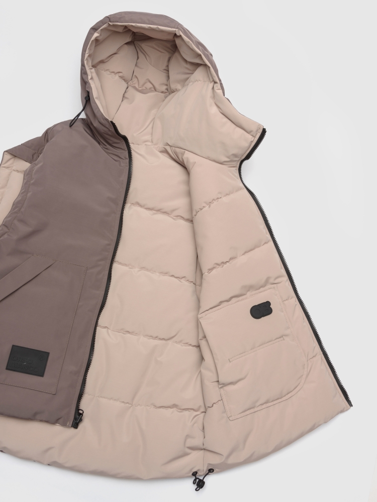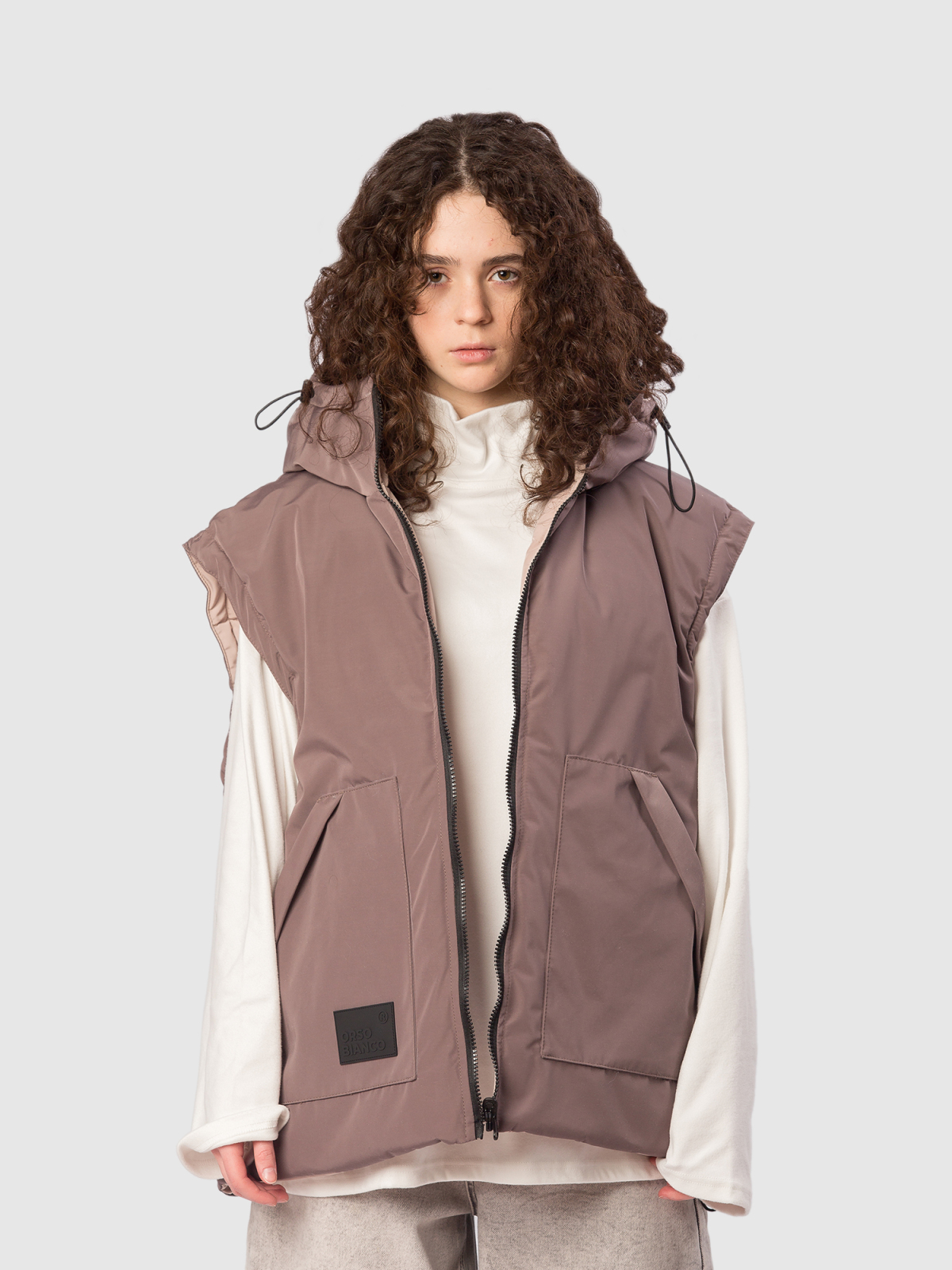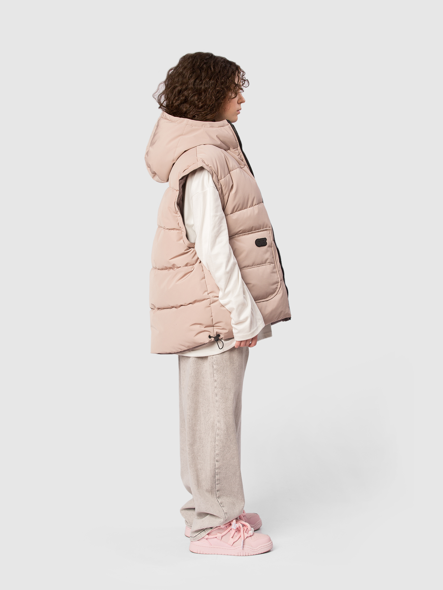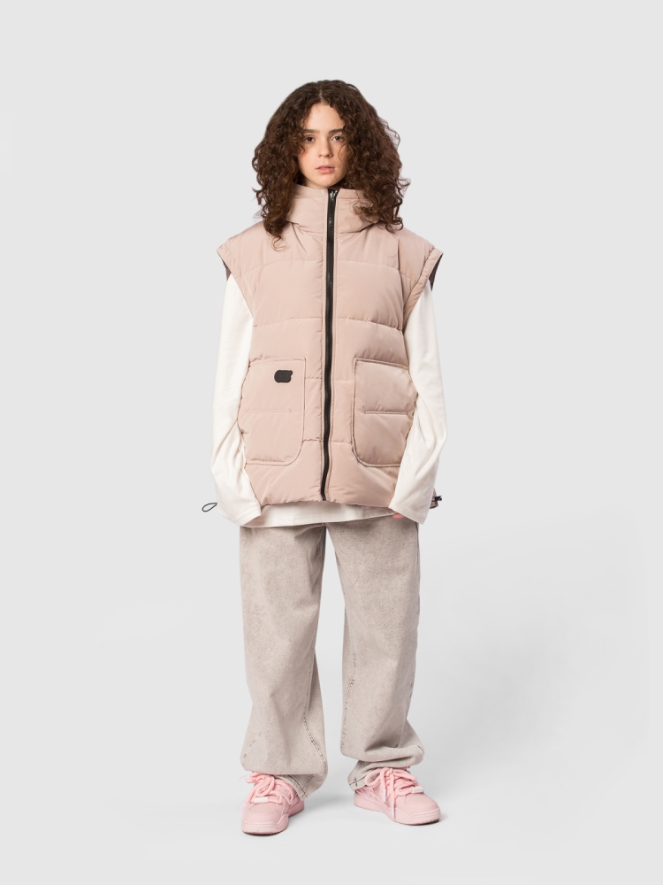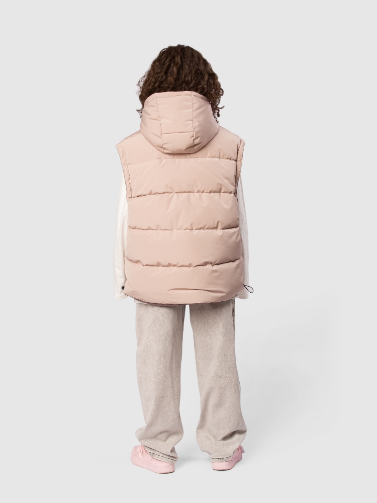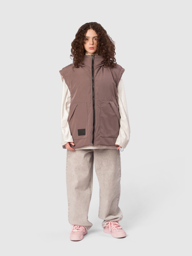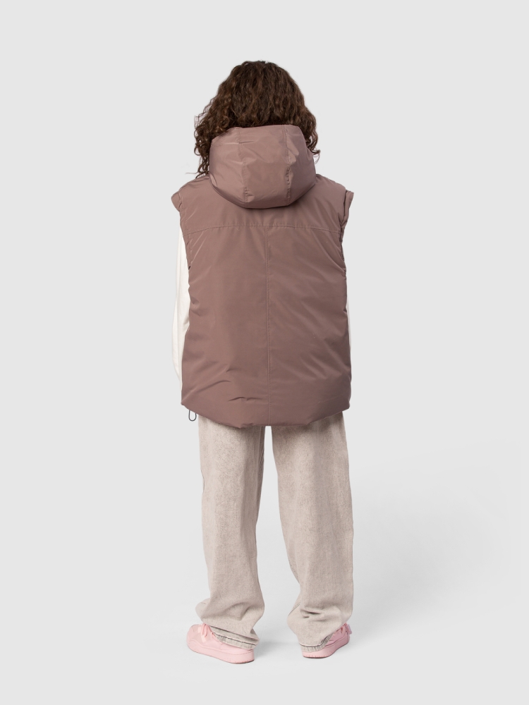 Двусторонняя жилетка для девочки-подростка с современным оверсайз-кроем и функциональностью, которая сочетает стиль и практичность на каждый день. Ткань с водоотталкивающей пропиткой защищает от легкого дождя и снега, сохраняя комфорт внутри. Утеплитель синтепух 150 г обеспечивает оптимальную теплоизоляцию без лишнего объёма, подходит для прохладной погоды и активных прогулок. Глубокий капюшон с регулировкой кулиской и стопперами надежно фиксирует посадку и защищает голову от ветра. Застежка на молнию с перекидным пуллером обеспечивает удобство одевания и возможность вентиляции по необходимости. На каждой стороне — два глубоких кармана для мелочей, теплых рук и смартфона. По низу изделия предусмотрена кулиска со стопперами, благодаря чему можно регулировать объём и посадку по фигуре и условиям погоды. Глубокая пройма обеспечивает свободу движений и комфорт при активной носке, независимо от типа активности ребёнка. Две яркие нашивки-логотипа бренда с обеих сторон добавляют стильный акцент и узнаваемость продук